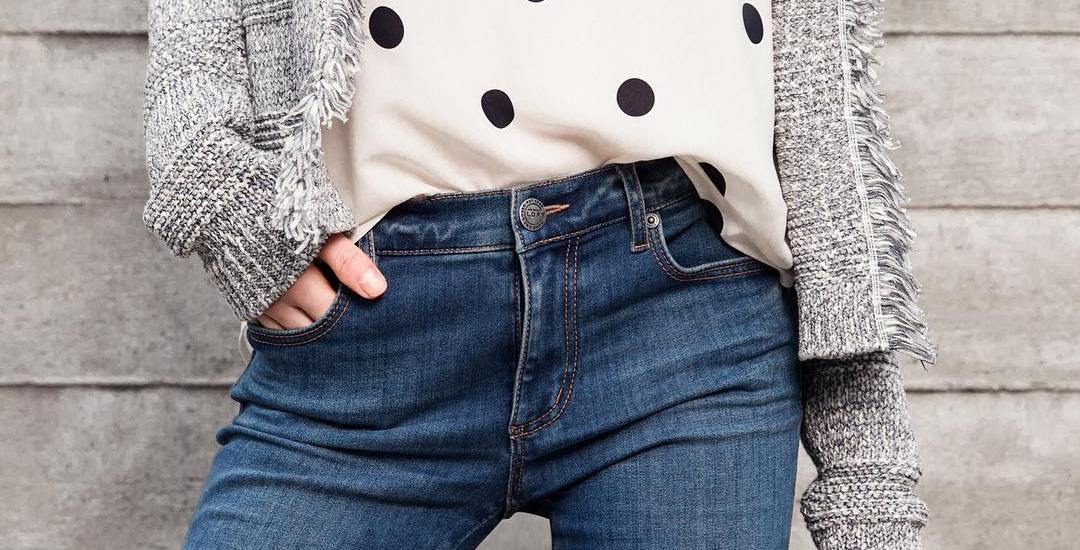 Polka dots are incredibly eye-catching and can be used to enhance your outfit. Pair a cardigan and a pair of jeans with dotted blouse, like this one from LOFT, for a pleasant pop. Spend $75 or more and receive 15% off of your total purchase with the NEX Outlets App.